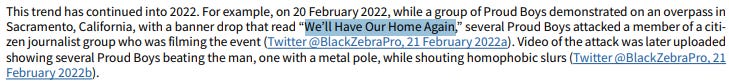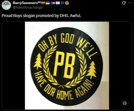The song’s title is a Proud Boys slogan and was printed on a banner at a 2022 event where Proud Boys beat a man with a metal pole while shouting homophobic slurs at him.