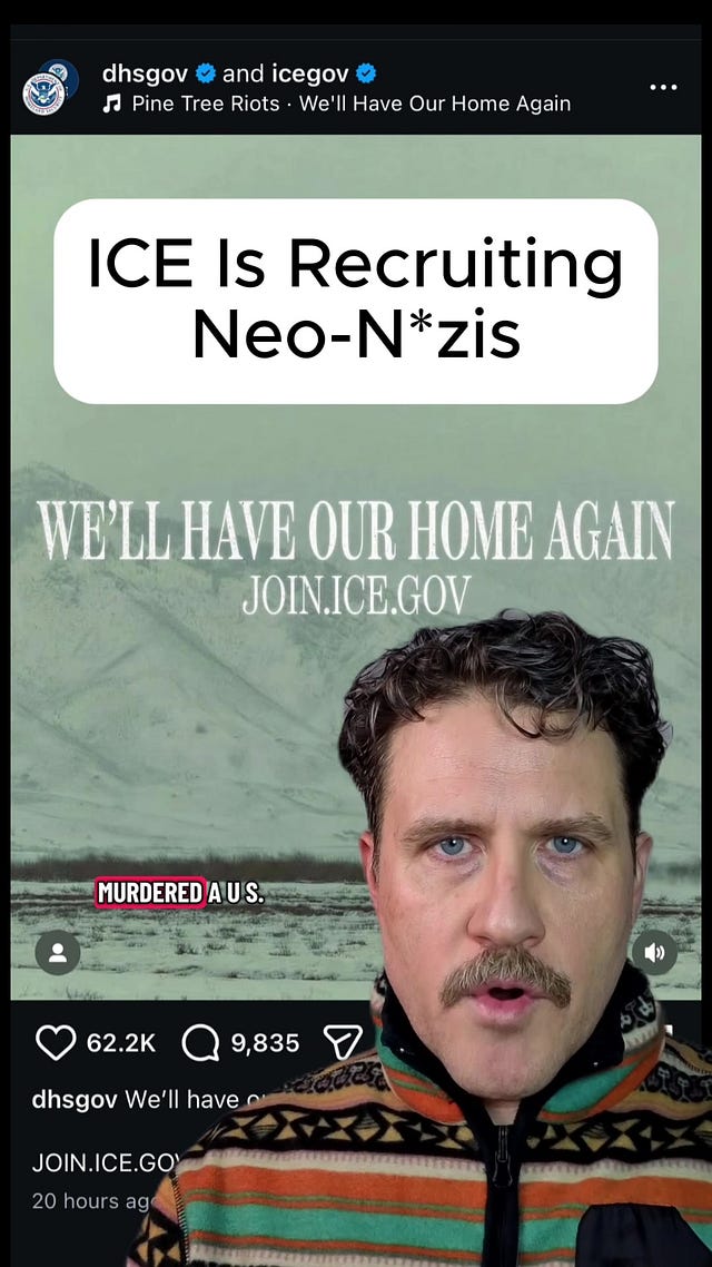 Two days after an ICE agent murdered a U.S. citizen in Minneapolis, official DHS and ICE accounts used a song popular with mass shooters and neo-Nazis in a recruitment post on Instagram.