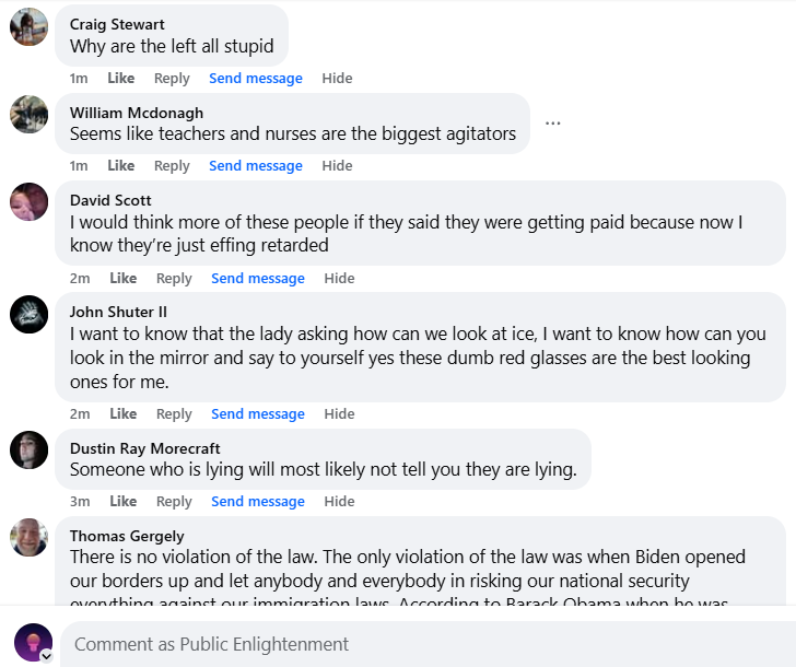 …I have seen ICE pepper spray peaceful civilians at close range, sometimes directly into their eyes. I have seen them toss tear gas at crowds. I have been gassed three times. They throw flash grenades for seemingly no reason whatsoever. This behavior almost always takes place as they are leaving a scene, a kind of farewell “fuck you” to the residents of the city they are terrorizing. They seem to enjoy hurting people.