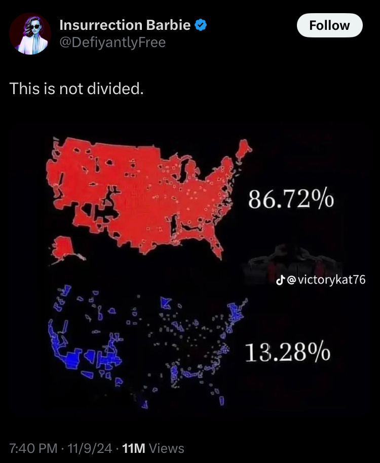 …with incoherent memes like the one below. The Insurrection Barbie account has millions of followers on X despite regularly spreading blatant propaganda. Conflating vote totals with land mass without any accounting for the concentration of humans in those areas is a manipulation meant to trick MAGA voters. It serves two false narratives pushed by MAGA leadership—Trump has an overwhelming mandate (he doesn’t) and elections are insecure (a myth pushed by the right for decades). Those propaganda narratives manufacture support from American citizens for the erosion of their own rights—to due process, for example. Further, they serve to provide (false) justification for the passage of voter suppression laws across the country.